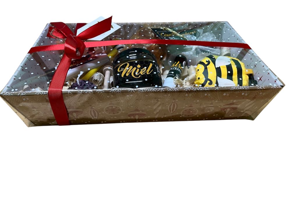 Esta Navidad, regala a tus seres queridos productos naturales y de calidad con esta cesta de cartón con dibujos navideños con una variedad de productos Valdepalacios: bote de 250 g, palo de madera para miel, caja de bombones (4 uds.), bolsa de caramelos de sabor aleatorio, chupa-miel, bálsamo labial, chocolatina, bolsa reutilizable y vela aromática.